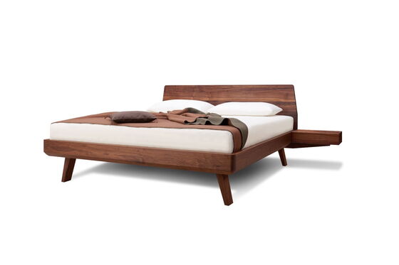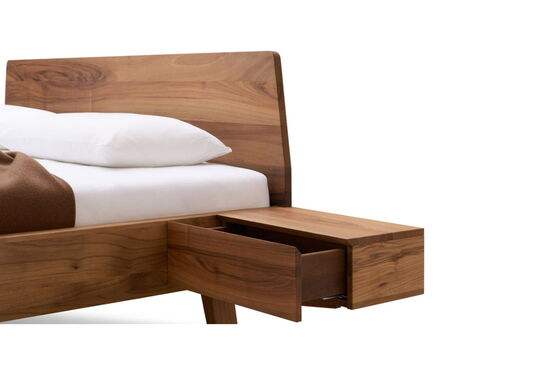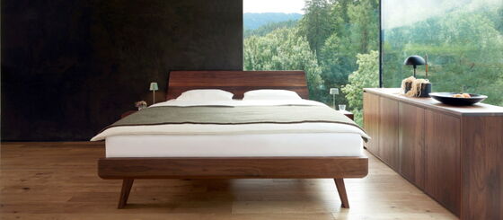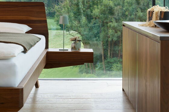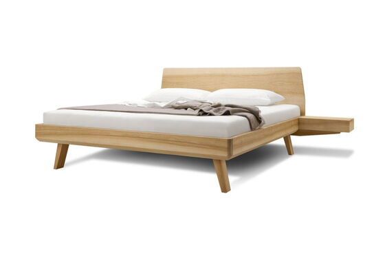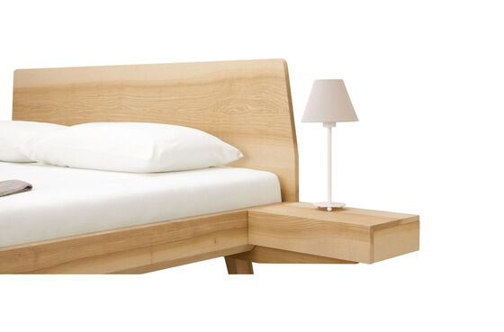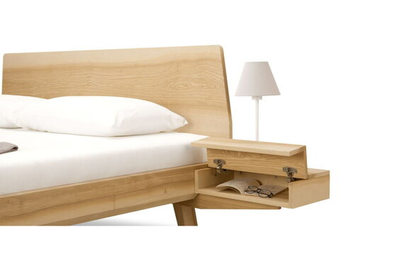 Elegant, leicht, harmonisch. Die Linie Elba mit sanften, abgerundeten Ecken fügt sich schwebend in den Raum ein. Ganz schön praktisch: die seitlich am Massivholzbett angebrachten Nachtkästchen mit sichtgeschütztem Ablagefach.