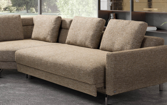 Abgerundet wird der Komfort durch die hochwertigen Lehnkissen, die mit speziellen Schaumstoffplättchen gefüllt sind. Diese sorgen für eine gleichmäßige, elegante Optik und gleichzeitig für ein angenehm weiches Anlehngefühl. Je nach Element sind ein oder zwei dieser Kissen bereits integriert. Optional können zusätzliche Komfortkissen ergänzt werden, die ein noch softeres Sitzgefühl bieten und gleichzeitig die Sitztiefe der Couch leicht reduzieren.