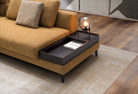 Ein integrierbares Tischelement aus Massivholz erweitert die Funktionalität der Couch zusätzlich. Dieses elegante Element kann sowohl innerhalb der Wohnlandschaft als auch als stilvoller Abschluss eingesetzt werden und fügt sich harmonisch in das Gesamtdesign ein. Der verschiebbare Einlegeboden schafft eine praktische zusätzliche Ablagefläche für Bücher, Fernbedienungen oder Dekoration. Die hochwertigen Holzelemente sind in den Farben Eiche, Wenge oder Schwarz lackiert erhältlich und lassen sich perfekt auf unterschiedliche Wohnstile abstimmen.