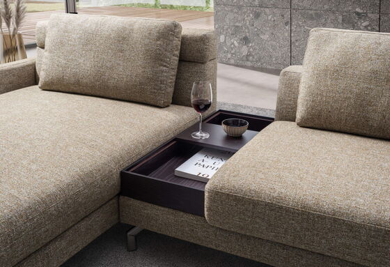 Für zusätzlichen Komfort stehen unterschiedliche Armteilvarianten zur Auswahl. Besonders beliebt ist das schlanke, nur 12 cm breite Polsterarmteil, das eine elegante Optik mit angenehmem Komfort verbindet. Alternativ kann ein stilvolles Formholzarmteil gewählt werden, das farblich perfekt auf das Tischelement abgestimmt ist und die moderne Designsprache der Garnitur unterstreicht.